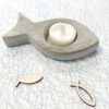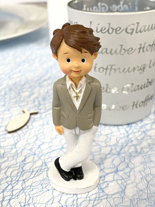 Teelichtfisch Beton 2 Stück, Serviette 40×40 cm 20 Stück, Motivserviette 33×33 cm 20 Stück, 1 Kommunionskind, 6 Kerzen, 500g Streukies, 2 Teelichtgläser, 32 Stk (2 Pak.) Holzstreu Fische, 1 Vase in Fischform, 10m Tischband